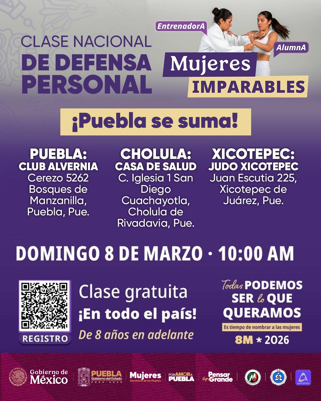 Puebla, Pue.– En el marco del8 de marzo este domingo 8 de marzo de 2026 se llevará a cabo la Clase Nacional gratuita de Defensa Personal “Mujeres Imparables”, una iniciativa dirigida a niñas y mujeres a partir de los 8 años de edad.