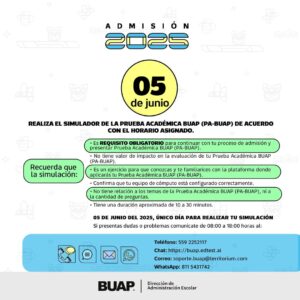 Cada aspirante debe consultar previamente el horario asignado para el simulador accediendo a su perfil en el portal de autoservicios: autoservicios.buap.mx. La recomendación de la institución es que se utilice el mismo equipo que se empleará en la evaluación oficial, la cual se realizará del 16 al 18 de junio para nivel superior y del 16 al 28 para nivel medio superior.