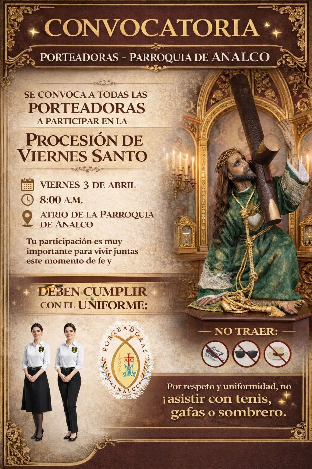 *La Parroquia de Analco en Puebla invita a porteadoras a participar en la procesión de Viernes Santo el 3 de abril; piden uniforme y respeto.