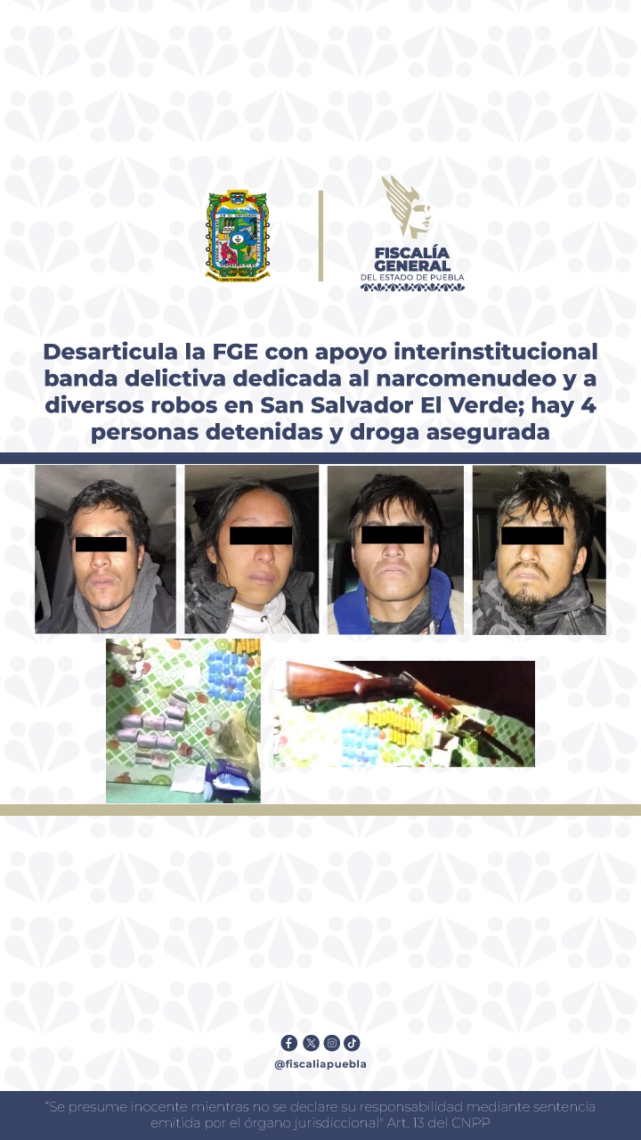 San Salvador El Verde, Pue.- Como resultado de un operativo interinstitucional, la Fiscalía General del Estado (FGE) logró desarticular en el municipio de San Salvador El Verde a una banda presuntamente dedicada al narcomenudeo y a la comisión de diversos robos.