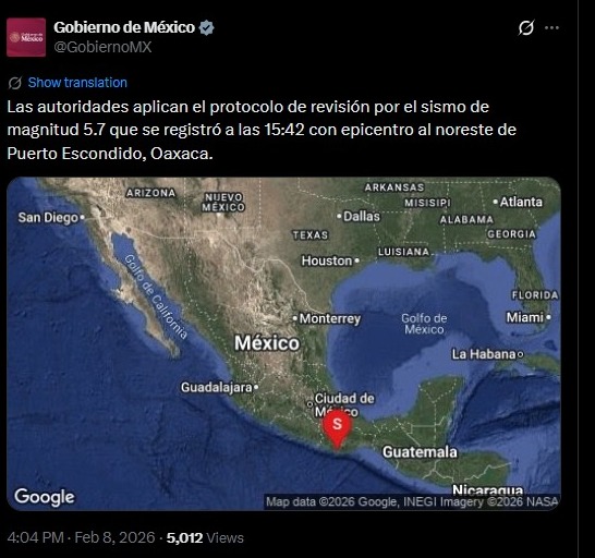 La Coordinación Nacional de Protección Civil (CNPC) informó que no se reportan daños ni afectaciones tras el sismo de magnitud 5.7 registrado este domingo 8 de febrero, con epicentro al noreste de Puerto Escondido, Oaxaca.