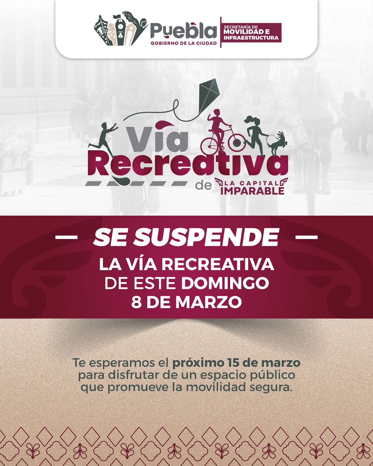 *La Vía Recreativa en Puebla no operará este 8 de marzo y reanudará actividades el domingo 15.