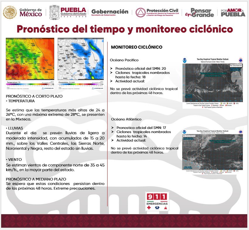 *Protección Civil Estatal reporta lluvias ligeras en zonas altas, vientos de hasta 45 km/h y sin actividad ciclónica en las próximas 48 horas.