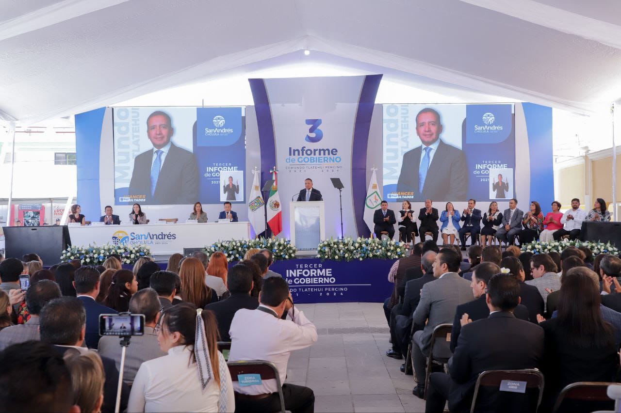 San Andrés Cholula, Puebla, 07 de octubre de 2024 – En un evento realizado en la Explanada del Palacio Municipal, el presidente municipal de San Andrés Cholula, Mundo Tlatehui, presentó su Tercer Informe de Gobierno.