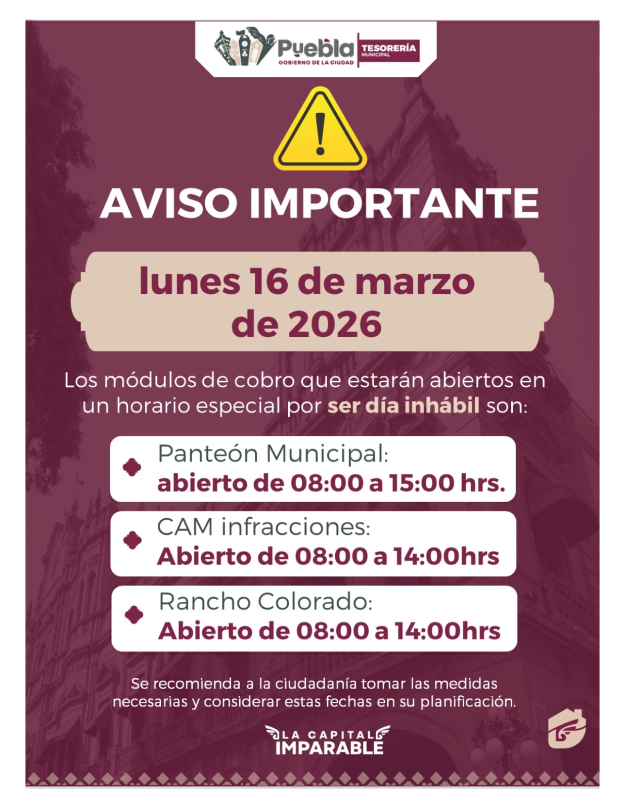 *El gobierno de Puebla informó que el 16 de marzo algunos módulos de cobro operarán con horario especial; servicios municipales continuarán con normalidad.