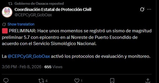 La Coordinación Nacional de Protección Civil (CNPC) informó que no se reportan daños ni afectaciones tras el sismo de magnitud 5.7 registrado este domingo 8 de febrero, con epicentro al noreste de Puerto Escondido, Oaxaca.