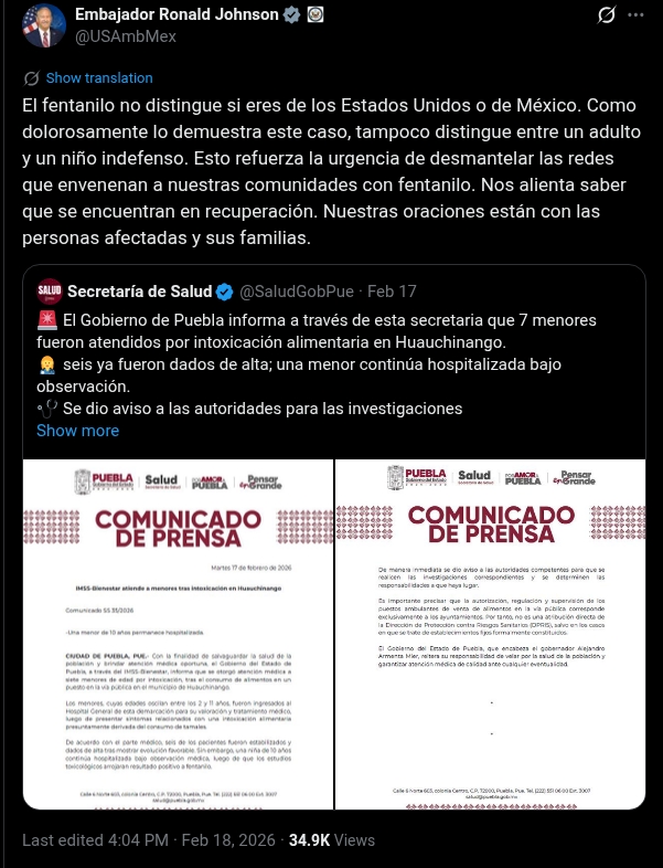 Embajador de EU alerta por crisis de fentanilo