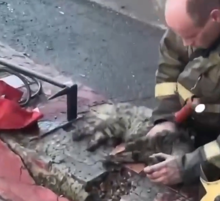 *Un bombero salvó a un gato inconsciente por inhalar humo tras un incendio en un edificio en Rusia.