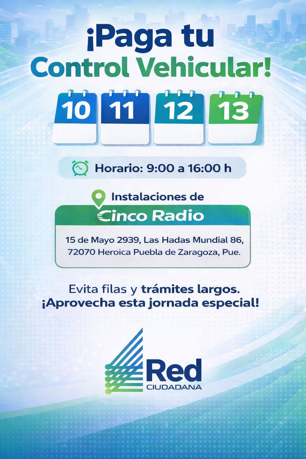 *Del 10 al 13 de febrero podrás realizar el pago de tu control vehicular en las instalaciones de Cinco Radio, en la 15 de Mayo 2939, colonia Las Hadas. Evita filas y mantente al corriente.