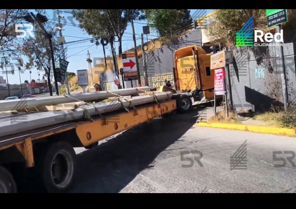 Cuautlancingo, Pue.-Un tráiler que transportaba postes de luz quedó atorado al mediodía del jueves 25 de marzo en el cruce de las calles Morelos y Tlaxcala, en el municipio de Cuautlancingo, luego de que se doblara una llanta del lado del piloto.