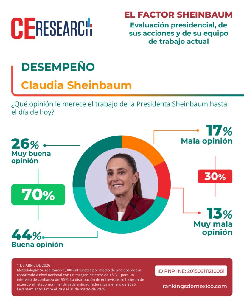 Sheinbaum alcanza 70% de aprobación en abril
