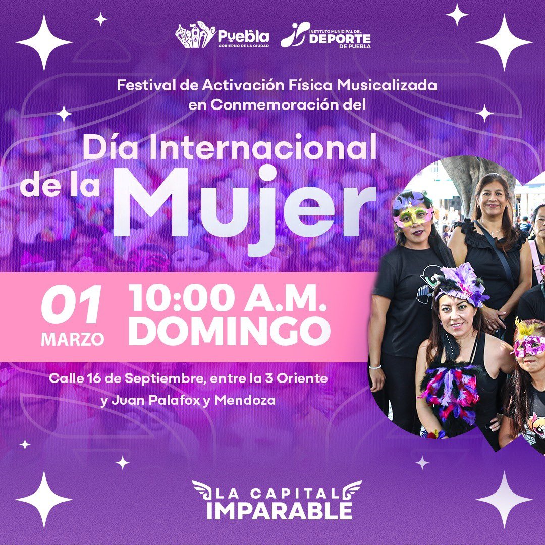 *Este 1 de marzo a las 10:00 A.M., participa en el Festival de Activación Física Musicalizada en la 16 de Septiembre, a un costado del Zócalo de Puebla.