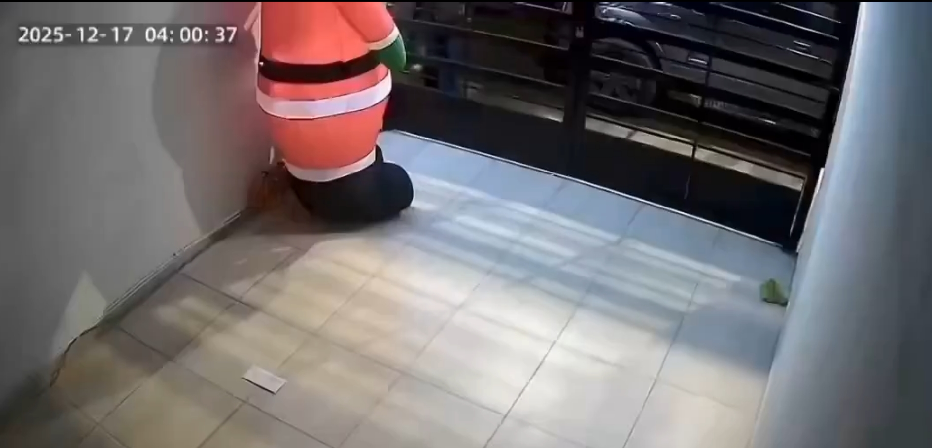 En las imágenes se observa cómo el presunto ladrón actúa con total tranquilidad. Tras acercarse al portón de la casa, desinfla el inflable navideño, lo dobla cuidadosamente y logra sacarlo entre los barrotes del portón, para posteriormente retirarse del lugar sin ser detectado.
