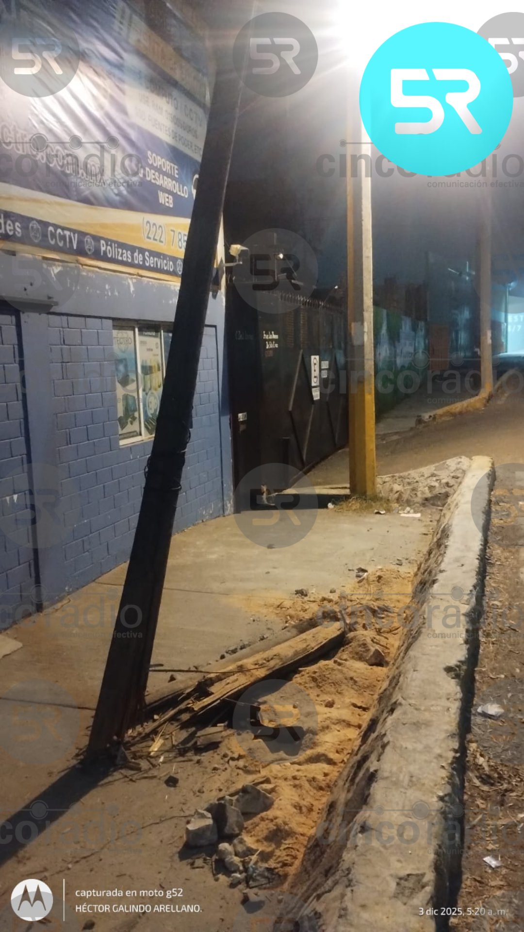 Puebla, Pue.— Durante la madrugada de este miércoles, un poste de servicios resultó severamente dañado sobre Bulevar Forjadores, a la altura del Fraccionamiento Viveros de Santa Cruz, luego de que un vehículo lo impactara de frente.