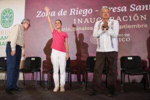 El Rosario, Sinaloa, a 27 de septiembre de 2024.- En el marco de la entrega de una nueva zona de riego de la presa “Santa María” en El Rosario, la Presidenta Electa, Claudia Sheinbaum Pardo, reafirmó su compromiso con el estado de Sinaloa, subrayando que seguirá siendo clave en la producción de alimentos en México.